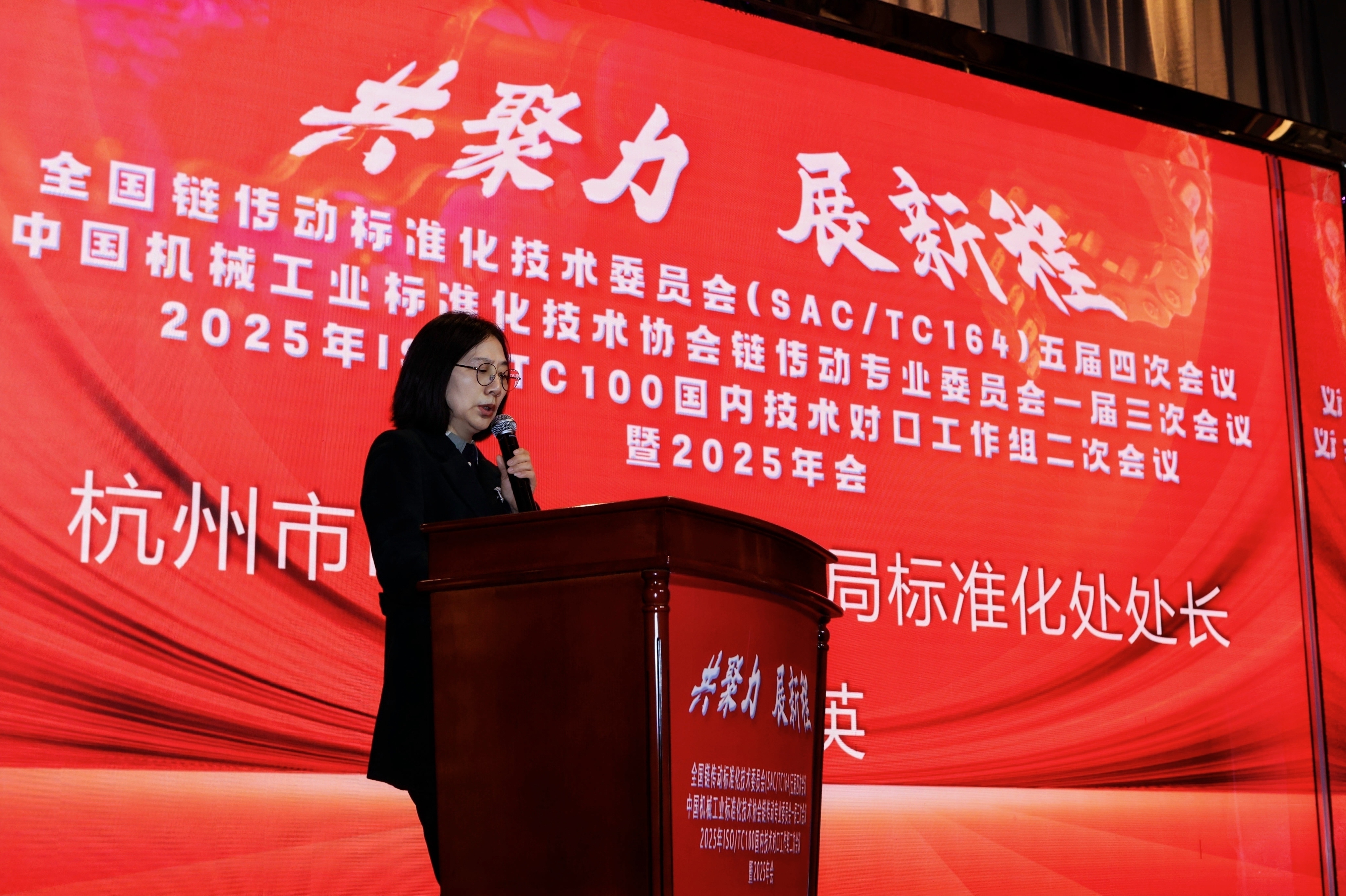 陈智英在讲话中,代表杭州市市场监督管理局向参加会议的各位委员、专家表示诚挚的欢迎!她表示,杭州是全国数字经济第一城,也更加重视先进的制造业,市委市政府正在推进296X先进制造产业集群的培育建设。链传动行业是高端装备制造业一个重要组成部分,是三大传动系统之一,是制造业的重要基石。数字化转型、先进制造业集群的培育将带动链传动产业升级赋能。标准是产业的基础,作为标准化主管部门,始终为杭州提供更强劲标准化的支撑,将积极推进现在产业的标准化建设,要注重传统领域的标准提升,新兴领域的标准创新,以标准赋能新质生产力,引领产业的高质量发展。杭州支持全国链传动标准化技术委员会工作,支持杭州企业积极参与国家标准、国际标准制修订,为制造业转型升级能够尽杭州力量。